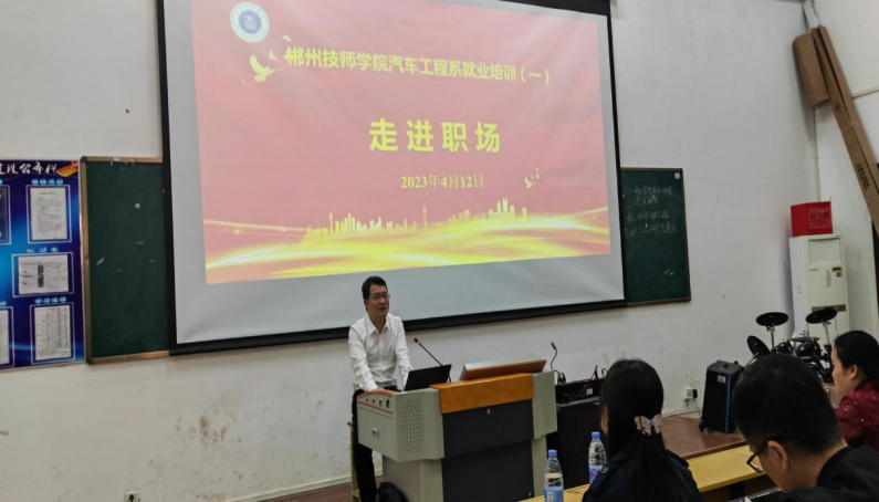 (通讯员 袁星星)4月11日,汽车工程系在招生就业处指导下,邀请郴州长虹格兰博人事主管、人力资源部肜立静部长走进课堂,为我系2019级180余名即将毕业的同学上了一堂《走进职场》的就业辅导课。学院党委委员、副院长彭德洪参加辅导活动并作讲话。