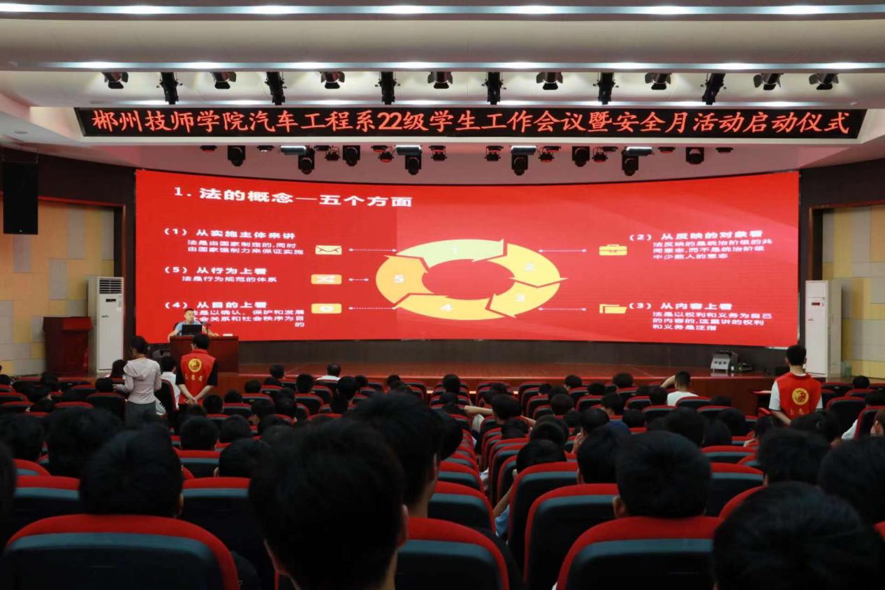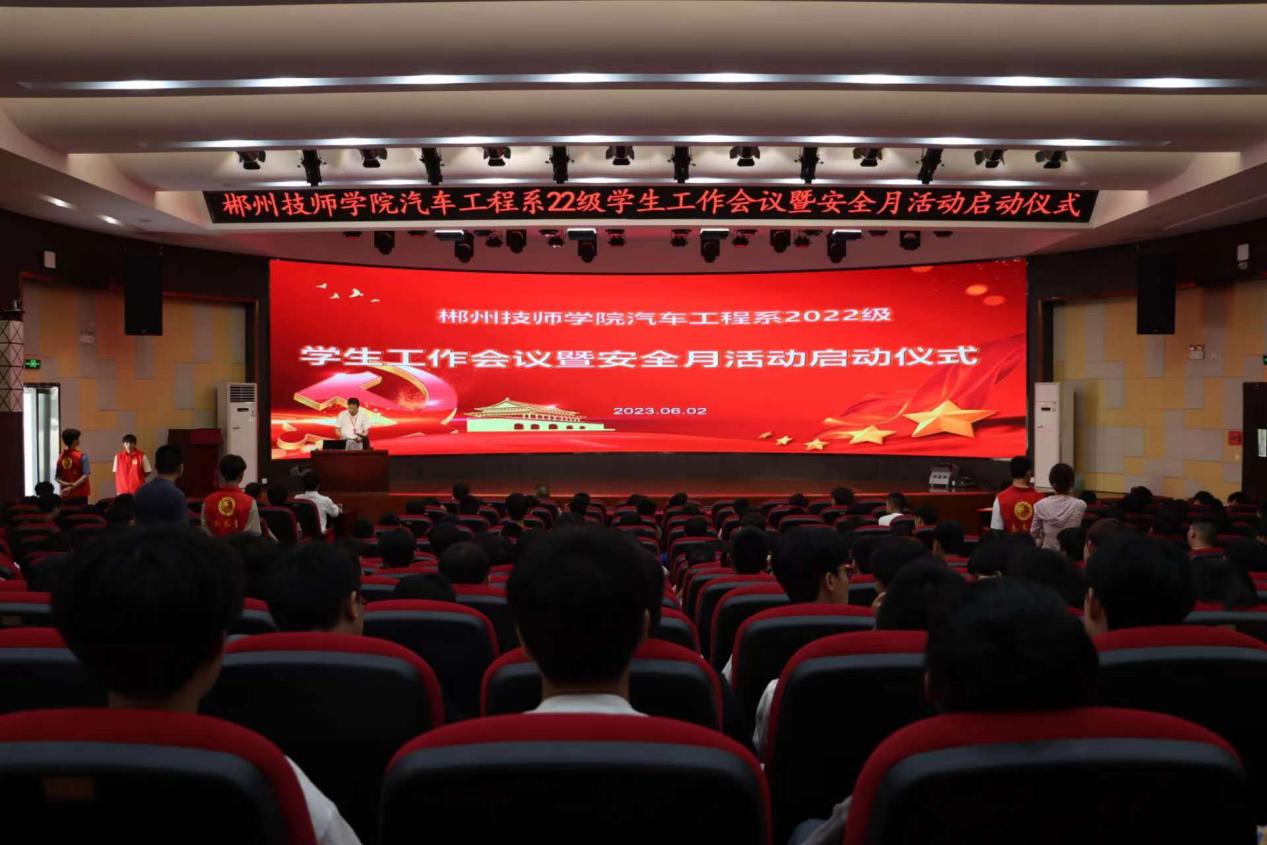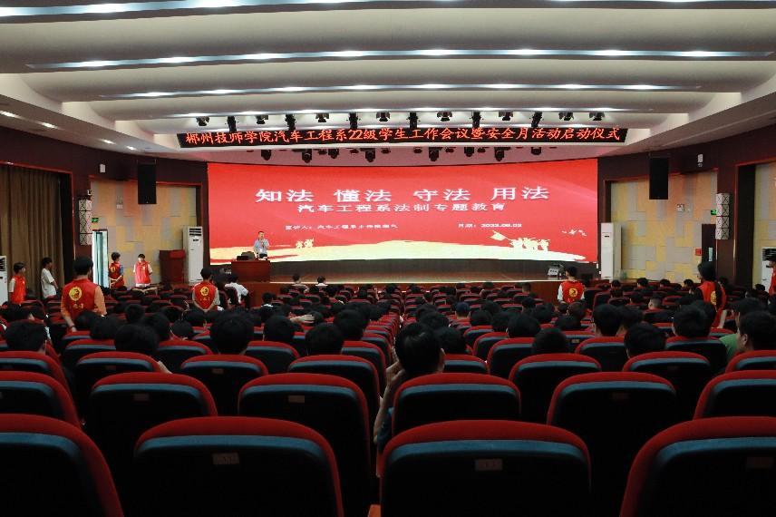 (图:唐伟平 文:陈露)6月2日下午,汽车工程系在新实训楼报告厅召开22级学生工作会议暨安全月活动启动仪式。系主任张朝气出席并作法制专题辅导,系党支部书记唐玉雄、系副主任李荣彬参加活动。